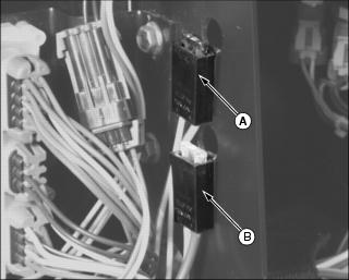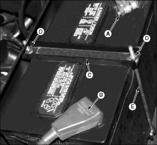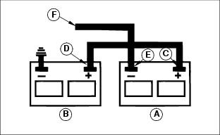 Service ElectricalChecking Battery Electrolyte Level1. Remove battery manifold caps (A). 2. Check electrolyte level. Electrolyte level (C) should be 6 mm (1/4 in.) above plates (D) and below filler neck (B). 3. Add distilled water if necessary. Removing and Installing the BatteryRemoving:1. Park machine safely. (See Parking Safely in the Safety section.) 3. Disconnect negative (-) battery cable (A). 4. Pull up red plastic cover (B) from positive (+) battery clamp and disconnect positive (+) cable clamp from battery post. 5. Remove battery hold down bracket (C) by removing lock nuts (D) from left and right side J-bolts (E). 6. Remove battery from machine. Installing:1. Install battery with positive post (+) towards rear of machine. 2. Install battery hold down bracket onto J-bolts and secure with lock nuts. 3. Install positive cable clamp (red cable) onto positive (+) battery post. Pull red plastic cover over positive cable clamp. 4. Install negative cable clamp (black cable) onto negative (-) battery post. Cleaning Battery and Terminals1. Disconnect and remove battery. 2. Wash battery with solution of four tablespoons of baking soda to one gallon of water. Be careful not to get the soda solution into the cells. 3. Rinse the battery with plain water and dry. 4. Clean terminals and battery cable ends with wire brush until bright. 5. Apply petroleum jelly or silicone spray to terminal to prevent corrosion. Using Booster Battery1. Connect positive (+) booster cable to booster battery (A) positive (+) post (C). 2. Connect the other end of positive (+) booster cable to the disabled vehicle battery (B) positive (+) post (D). 3. Connect negative (-) booster cable to booster battery negative (-) post (E). 4. Connect the other end (F) of negative (-) booster cable to a metal part of the disabled machine frame away from battery. 5. Start the engine of the disabled machine and run machine for several minutes. 6. Carefully disconnect the booster cables in the exact reverse order: negative cable first and then the positive cable. Checking and Replacing Fuses1. Remove right side electrical service panel to access fuse holders. 2. Fuse (A) is the 15 ampere main fuse and controls all electrical functions on the machine, including light kit. 3. Fuse (B) is the 20 ampere accessory fuse and is only used for the optional cab kit. 4. Test fuses with voltmeter or test light and replace if blown. |