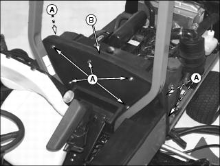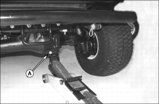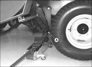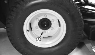 Removal1. Raise side deck completely at side of machine requiring rear wheel removal. Leave other side deck lowered completely. 2. Engage the side deck transport lock. 3. Lower front deck completely. 4. Park machine safely. (See Park Safely in SAFETY section.) 5. Using a safe lifting device, jack up machine under rear axle (A) so both rear wheels are above the ground. 6. Install jack stands under rear axle (B). 7. Lower machine onto jack stands. 8. Remove wheel bolts and wheel from rear axle. Installation1. Install wheel onto axle hub with valve stem facing outward. Secure with wheel bolts. 2. Tighten rear wheel bolts to 81 - 95 Nˇm (60 - 70 lb-ft) using torque wrench. 3. Using a safe lifting device, jack up machine under rear axle (B). 4. Remove jack stands from under machine. |