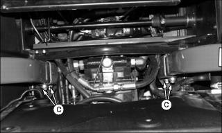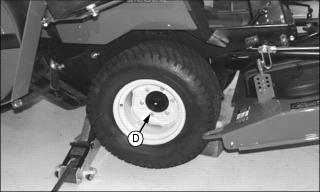 6. Using a safe lifting device, jack up machine at base of lift arm bracket (A) or under the front skid plate if adequate clearance exists. 7. Install blocking material (B) under front skid plate (C). 9. Remove wheel bolts (D) and wheel. Installing Front Tires1. Install wheel onto axle hub with valve stem facing outward. Secure with wheel bolts (A). 2. Tighten front wheel bolts to 136 - 163 Nˇm (100 - 120 lb-ft) using torque wrench.