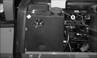 Service MiscellaneousFilling Fuel TankAdd stabilizer to fuel before using it in your machine to prevent engine damage due to stale fuel. Follow directions on stabilizer container. 1. Park machine safely. (See Park Safely in SAFETY section.) 3. Allow engine to cool several minutes. 4. Remove any debris from area around fuel tank cap (A). 6. Fill tank with fresh, stabilized fuel only to bottom of filler neck. Cleaning and Repairing Metal SurfacesCleaningFollow automotive practices to care for the painted surfaces of your machine. Use a high-quality automotive wax regularly to maintain the factory look of painted surfaces. Repairing Minor Scratches (Surface Scratches)1. Clean area to be repaired thoroughly. 2. Use automotive polishing compound to remove surface scratches. 3. Apply wax to entire surface. Repairing Deep Scratches (Bare Metal or Primer Showing)1. Clean area to be painted with rubbing alcohol or mineral spirits. 2. Use paint stick with factory-matched colors available from your John Deere dealer to fill scratches. Follow directions included on paint stick for use and for drying. 3. Smooth out surface using an automotive polishing compound. Do not use power buffer. Tightening ROPS Hardware1. Park machine safely. (See Park Safely in SAFETY section.) 2. Raise the seat platform and engine cover. 3. Remove hardware (A) securing plastic back panel (B) to machine. Retain all hardware. 4. Carefully lift back panel from machine and set it aside. 5. Tighten the four ROPS attaching bolts (C) to 136 Nˇm (100 lb-ft). 6. Install plastic back panel and secure with attaching hardware. 7. Lower seat platform and engine cover. Removing and Installing Front TiresRemoving Front Tires1. Raise side deck completely on side of machine requiring front wheel removal. Leave other side deck lowered completely. 2. Engage the side deck transport lock. 3. Raise front mower deck completely. 4. Park machine safely. (See Park Safely in SAFETY section.) 5. Rotate front deck for service to obtain as much clearance as possible between rear of deck and ground surface.
