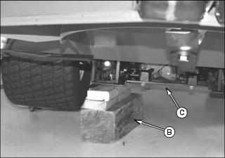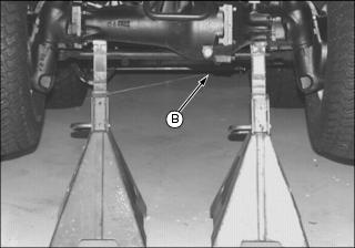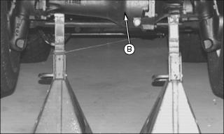 3. Using a safe lifting device, jack up machine at base of lift arm bracket (B) or under the front skid plate if adequate clearance exists. 4. Remove blocking material from under machine. ˇ After traveling 30 m (100 ft) while changing direction. Removing and Installing Rear Tires