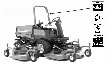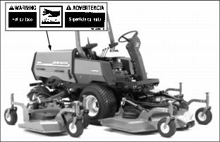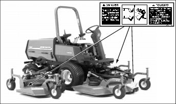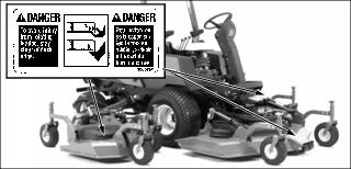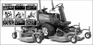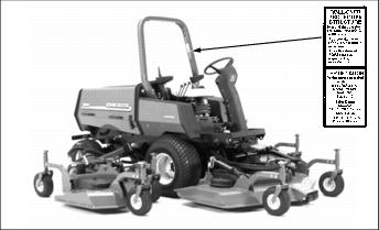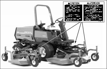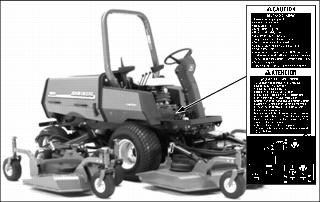 SafetyUnderstanding the Machine Safety LabelsThe machine safety labels shown in this section are placed in important areas on your machine to draw attention to potential safety hazards. On your machine safety labels, the words DANGER, WARNING, and CAUTION are used with this safety-alert symbol,. DANGER identifies the most serious hazards. The operator's manual also explains any potential safety hazards whenever necessary in special safety messages that are identified with the word, CAUTION, and the safety-alert symbol,. CAUTIONAVOID INJURYˇ Do not operate mower with shields removed ˇ Stay clear of power driven parts BEFORE SERVICINGˇ Shut off engine and remove key ˇ Lower or secure mower in raised position with service link WARNINGCAUTIONˇ Keep people a safe distance away ˇ Stay clear of power driven parts ˇ Do not operate where machine could tip ˇ Roll-over protection structure (ROPS) should be installed unless prohibited by low clearance operation ˇ Use seat belt unless machine is operated without ROPS - Stop engine - Set park brake - Remove key DANGERTo avoid injury form rotating blades and thrown objects, stay clear of deck edge and keep others away. WARNINGTo avoid injury while transporting, keep front attachment low and avoid sharp turns with side attachments in transport position. To avoid injury, avoid quick stops and reduce speed on slopes. All wheels drive. To avoid injury from crushing, do not operate with only one axle raised DANGERTo avoid injury from rotating blades, stay clear of deck edge. WARNINGTo avoid injury from crushing, always wear seat belt. Do not jump from machine. ROLL-OVER PROTECTIVE STRUCTURETo maintain operator protection and ROPS certification: ˇ Replace damaged ROPS, do not repair or revise. ˇ Any alteration of ROPS must be approved by manufacturer CERTIFICATIONPerformance certified at date of manufacture to: OSHA: 29 CFR, Part 1928, Subpart C, John Deere Mowers, Deere & Company, Moline, Illinois Emissions Control System Certification Label (NonRoad Diesel)The emissions warranty described below applies only to those engines marketed by John Deere that have been certified by the United States Environmental Protection Agency (EPA) and/or California Air Resources Board (CARB); and used in the United States in non-road mobile (self-propelled or portable/transportable1) equipment. The presence of an emissions label like the one shown signifies that the engine has been certified with the EPA and/or CARB. The EPA and CARB warranties only apply to new engines having the certification label affixed to the engine and sold as stated above in the geographic areas governed by the regulating agencies. NOTE: The hp/kW rating on the engine emissions certification label specifies the gross engine hp/kW, which is flywheel power without fan. In most applications this will not be the same rating as the advertised vehicle hp/kW rating. Certification LabelThis model has been tested and evaluated by the manufacturer and conforms to American National Standard Institute B-71.4 safety specifications for commercial turf care equipment as a ride-on turf tractor. Operator Training Requiredˇ The owner of the machine is responsible for training the users of the machine. ˇ The owner/user can prevent and is responsible for accidents or injuries occurring to themselves, other people, or property. ˇ Do not allow operation of the machine by untrained persons. ˇ Study the safety and operation sections of this manual before operating the machine. ˇ If the operator of the machine cannot read English, the machine owner's responsibility to explain this material to the operator. This publication is available in other languages. ˇ Operate machine in an open, unobstructed area under the direction of an experienced operator. ˇ Learn the use of all controls. ˇ Operator experience is required to learn the moving, stopping, turning and other operating characteristics of the machine. Wear Appropriate Clothingˇ Wear close fitting clothing and safety equipment appropriate for the job. ˇ Wear a suitable protective device such as earplugs. Loud noise can cause impairment or loss of hearing. ˇ Do not wear radio or music headphones. Safe service and operation requires your full attention. Operating Safelyˇ Inspect machine before you operate. Be sure hardware is tight. Repair or replace damaged, badly worn, or missing parts. Be sure guards and shields are in good condition and fastened in place. Make any necessary adjustments before you operate. ˇ Check before each use that operator presence controls are functioning correctly. Test safety systems. Do not operate unless they are functioning correctly. ˇ Do not change the engine governor setting or overspeed the engine. ˇ Check brake action before you operate. Adjust or service brakes as necessary. ˇ Stop machine if anyone enters the area. ˇ Never raise mower decks when blades are running. ˇ If you hit an object, stop and inspect the machine. Make repairs before you operate. Keep machine and attachments properly maintained and in good working order. ˇ Do not leave machine unattended when it is running. ˇ Only operate during daylight or with good artificial light. ˇ Slow down and be careful of traffic when operating near or crossing roadways. Stop blades before crossing roads or sidewalks. Use care when approaching blind corners, shrubs, trees, or other objects that may obscure vision. ˇ Be aware of the mower discharge direction and do not point it at anyone. ˇ Do not wear radio or music headphones while operating the machine. Safe operation requires your full attention. Checking Mowing Areaˇ Clear mowing area of objects that might be thrown. Keep people and pets out of mowing area. ˇ Study mowing area. Set up a safe mowing pattern. Do not mow where traction or stability is doubtful. ˇ Test drive area with mower lowered but not running. Slow down when you travel over rough ground. Avoid Tippingˇ Do not drive where machine coul