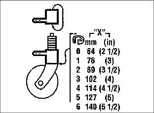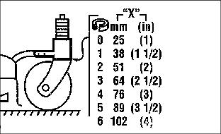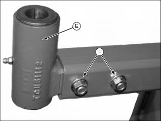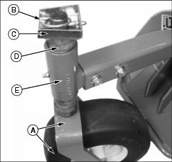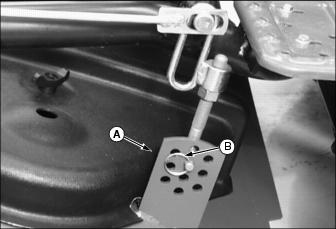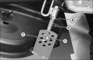 Operating Mower Deck - 1600Adjusting Cutting Height1. Stop machine on level surface, PTO off, park brake locked. 2. Raise all mower decks. Engage left and right side deck transport locks. Stop engine. 3. Check tire pressures on all machine tires, and deck caster wheels. ˇ Machine front tires: 140 kPa (20 psi) ˇ Machine rear tires: 140 kPa (20 psi) ˇ Mower deck caster wheels: 275 kPa (40 psi) Adjusting Front Deck Cutting Height1. Remove retainer ring (A) from deck hanger pin (B) on left and right side of front deck. 2. Using the figure above, or decal mounted on front deck, place deck hangers into holes that match desired cutting height. 3. Install retainer rings into hanger pins. 4. Adjust caster wheels on front deck to match cutting height selected on hanger. Adjusting Caster Wheels Cutting HeightNOTE: This adjustment is for all caster wheels on front and side mower decks. 2. Support the caster wheel and bracket (A) with one hand, while removing quick-lock pin (B) and spacer guard (C). 3. Remove the spacers (D) from the top of the caster pivot shaft. 4. Lower the caster and pivot shaft out of the caster support bracket (E). 5. Use the figures above, or decal mounted on front mower deck to select the number of spacers needed to set caster wheel to desired height. 6. Flip caster support brackets over to adjust blades to higher than 102 mm (4 in.) cutting height. ˇ To flip the caster support brackets (E), remove two cap screws, nuts, and bushings (F), holding support bracket to mower deck arm. Remove bracket from arm, flip over bracket, and install back into arm. 7. Install cap screws and nuts, but do not tighten nuts at this time. 8. Install the proper number of spacers (F) onto the caster shaft. 9. Install the caster wheel and bracket (G) up though the caster support bracket (H). 10. Install remaining spacers (I) onto the top of the caster shaft. NOTE: When adjusting side decks to 25 mm (1 in.) height of cut, do not install spacer guard (J) on inside caster wheel pivot. Spacer guard may contact engine cover when side deck is raised. 11. Install the spacer guard (J) with open end facing forward (as shown). 12. Install quick-lock pin (K) into caster shaft and hole in spacer guard. Snap retainer loop over caster shaft. 13. If cutting height was adjusted above 102 mm (4 in.), perform the follow steps: a. Lower mower deck to ground. b. Turn caster wheels so they are trailing to the rear (as would happen during normal forward travel). c. Tighten caster support bracket hardware. Checking Mower Deck Level1. Park machine safely. (See Parking Safely in the SAFETY section.) 2. Lower all mower decks completely to ground. 3. Check tire pressures on all machine tires, and deck caster wheels. ˇ Machine front tires: 140 kPa (20 psi) ˇ Machine rear tires: 140 kPa (20 psi) ˇ Mower deck caster wheels: 275 kPa (40 psi) 4. Set the mower decks at the desired cutting height. 5. Check that the front mower deck caster wheels and rear hangers are all set to the same height. 6. Check that all caster wheels are trailing towards the rear, as they would be during normal forward travel. 7. Turn the blades until parallel to the front axle. Picture Note: A convenient leveling gauge (A) is available from your John Deere dealer that will slip under the lip of the deck and measure blade height. 8. Measure distance from tip of outside blade (B), to the ground. Repeat for blade on other side of deck. Mower blades should be level on both sides of deck. 9. Turn outer mower blades to face front-to-rear. 10. Measure height of front and rear of outer blade to ground. Repeat for other side. ˇ The blade cutting heights should be level side-to-side. ˇ The rear tips of the blades should be 6mm (0.25 in.) higher than the front blade tips. Adjusting Mower Deck Level1. Park machine safely. (See Parking Safely in the SAFETY section.) 2. Lower all mower decks completely to ground. 3. Check tire pressures on all machine tires, and deck caster wheels. ˇ Machine front tires: 140 kPa (20 psi) ˇ Machine rear tires: 140 kPa (20 psi) ˇ Mower deck caster wheels: 275 kPa (40 psi) 4. Set the mower decks at the desired cutting height. 5. Turn all caster wheels so they are trailing to the rear (as would happen during normal forward travel). Adjusting Front Mower Deck Level1. Loosen lock nut (A) on deck hanger (B). 2. Remove retainer ring (C) on hanger pin (D). 3. Turn rear hanger up or down to adjust deck height until blades are level side-to-side and front-to-rear. 4. Insert hanger pin (D) back into proper height adjuster hole, and secure with retainer ring. NOTE: It may be necessary to reduce caster wheel air pressure on one side only to help level mower deck. Adjusting Side Mower Deck LevelThe side mower deck level can be adjusted by lowering the air pressure in the two caster wheels on the side which is high. Do not exceed recommended air pressure in tires. Engaging BladesNOTE: Operate engine at full throttle while mowing. 2. Move speed range lever to the low speed range position. 4. Lower mower decks to ground. 5. Move throttle forward to full throttle position. 6. Pull up on PTO switch lever and move switch to the on position. ˇ Blades should start and PTO indicator lights should light up. ˇ If one side deck is not lowered, the indicator light for that deck will flash, and blades for that deck will not start up until deck is lowered. ˇ If front deck is not lowered, none of the blades will start up. 7. Raise decks to disengage blades: ˇ If a side deck is raised while mowing, the blades for that deck will stop when it is raised, and the PTO indicator light for that deck will flash. Blades will start up again once the deck is lowered. ˇ If the front deck is raised while mowing, all blades on all decks will stop. Once front deck is lowered, the PTO switch will have to be cycled on-off-on to restart blades. ˇ Move the PTO switch to the off position to stop all blades. |