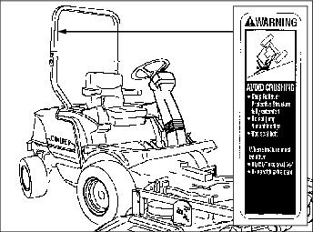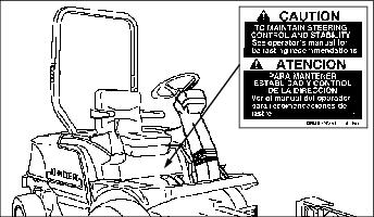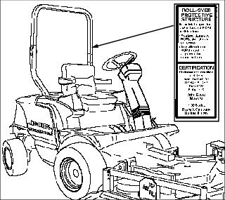 SafetyUnderstanding the Machine Safety LabelsThe machine safety labels shown in this section are placed in important areas on your machine to draw attention to potential safety hazards. On your machine safety labels, the words DANGER, WARNING, and CAUTION are used with this safety-alert symbol,. DANGER identifies the most serious hazards. The operator's manual also explains any potential safety hazards whenever necessary in special safety messages that are identified with the word, CAUTION, and the safety-alert symbol,. WARNINGCAUTIONˇ Keep children and others away ˇ Stay clear of power driven parts ˇ Do not operate where machine could tip ˇ Roll-over protection structure (ROPS) should be raised unless prohibited by low clearance operation ˇ Use seat belts unless ROPS is in lowered position WARNINGˇ Move very slowly when attachment is removed ˇ Keep attachment low when transporting WARNINGˇ Keep Rollover Protective Structure fully extended CAUTIONTO MAINTAIN STEERING CONTROL AND STABILITY See operator's manual for ballasting recommendations ROLL-OVER PROTECTIVE STRUCTURETo maintain operator protection and ROPS certification: ˇ Replace damaged ROPS, do not repair or revise ˇ Any alteration of ROPS must be approved by manufacturer CERTIFICATIONPerformance certified at date of manufacture to: Two Post ROPS - OSHA: 29 CFR, Part 1928, Subpart C John Deere Mowers, 1400 Series Deere & Company, Moline, Illinois, U.S.A. Emissions Control System Certification Label (NonRoad Diesel)The emissions warranty described in the warranty section applies only to those engines marketed by John Deere that have been certified by the United States Environmental Protection Agency (EPA) and/or California Air Resources Board (CARB); and used in the United States in non-road mobile (self-propelled or portable/transportable) equipment which is moved at least once every 12 months. The presence of an emissions label like the one shown signifies that the engine has been certified with the EPA and/or CARB. The EPA and CARB warranties only apply to new engines having the certification label affixed to the engine and sold as stated above in the geographic areas governed by the regulating agencies. NOTE: The hp/kW rating on the engine emissions certification label specifies the gross engine hp/kW, which is flywheel power without fan. In most applications this will not be the same rating as the advertised vehicle hp/kW rating. Emission Control System Certification Label (Small Off-Road Gas Engines)NOTE: Tampering with emission controls and components by unauthorized personnel may result in severe fines or penalties. Emission controls and components can only be adjusted by EPA and/or CARB authorized service centers. Contact your John Deere Commercial and Consumer Equipment Retailer concerning emission controls and component questions. The presence of an emissions label signifies that the engine has been certified with the United States Environmental Protection Agency (EPA) and/or California Air Resources Board (CARB). The emissions warranty applies only to those engines marketed by John Deere that have been certified by the EPA and/or CARB; and used in the United States and Canada in off-road mobile equipment. Emission Compliance Period (Small Off-Road Gas Engines)If your engine has the emission compliance category listed on the emission control system certification or air index label, this indicates the number of operating hours for which the engine has been certified to meet EPA and/or CARB emission requirements. The following table provides the engine compliance period in hours associated with the category found on the certification label. Certification LabelThis model has been tested and evaluated by the manufacturer and conforms to American National Standard Institute B-71.4 safety specifications for commercial turf care equipment as a ride-on turf tractor with approved attachments. Operator Training Requiredˇ The owner of the machine is responsible for training the users and mechanics of the machine. ˇ The owner/user can prevent and is responsible for accidents or injuries occurring to themselves, other people, or property. ˇ Do not allow operation or service of the machine by children or untrained adults. ˇ Read the operator's manual and study the safety and operation sections before operating the machine. ˇ If the operator of the machine cannot read or understand this manual, it is the machine's owner responsibility to explain this material to the operator. This publication is available in other languages. ˇ Operate the machine in an open, unobstructed area under the direction of an experienced operator. ˇ Learn the use of all controls. ˇ Operator experience is required to learn the moving, stopping, turning and other operating characteristics of the machine. Wear Appropriate Clothingˇ Wear close fitting clothing and safety equipment appropriate for the job. ˇ Always wear safety goggles or safety glasses with side shields when operating the mower ˇ Wear a suitable protective device such as earplugs. Loud noise can cause impairment or loss of hearing. ˇ Do not wear radio or music headphones. Safe service and operation requires your full attention. Operating Safelyˇ Inspect machine before you operate. Be sure hardware is tight. Repair or replace damaged, badly worn, or missing parts. Be sure guards and shields are in good condition and fastened in place. Make any necessary adjustments before you operate. ˇ Check before each use that operator presence controls are functioning correctly. Test safety systems. Do not operate unless they are functioning correctly. ˇ Do not change the engine governor setting or overspeed the engine. ˇ Always wear seat belt if machine has a standard ROPS or a folding ROPS in the upright position. ˇ Check brake action before you operate. Adjust or service brakes as necessary. ˇ Stop machine if anyone enters the area. ˇ Never raise mower decks when blades are runnin