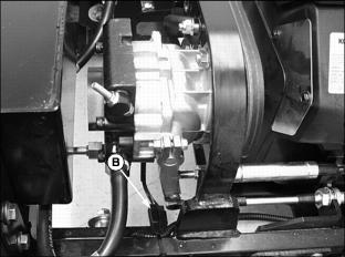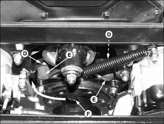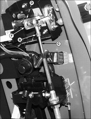 NOTE: The transmission drive belt will not require a tension adjustment. Belt is self-adjusted using a spring tensioner. Checking Belt:1. Park machine safely. (See Parking Safely in the Safety section.) 3. Disconnect spark plug wires. 4. Inspect belt (A) for excessive wear, damage or stretching while in position on the transmission sheaves and drive belt tensioner pulley. Replacing Belt1. Disconnect PTO clutch electrical connection (B) located below the left steering pump. NOTE: Do not remove the PTO driveshaft from the mower deck gearbox.This service procedure is easier when the driveshaft is removed from the clutch housing. 2. Disconnect mower deck PTO driveshaft by removing four hex bolts (C). 3. Remove lock nuts (D) and PTO clutch bumpers (E). 4. Stand on the right side of the front mower. Pull and hold spring loaded pump drive belt tensioner handle (F) rearward. 5. Remove belt from drive sheaves and idler pulley. Picture Note: Belt installation as viewed from the rear of the machine. · Pull and hold belt tensioner handle (F). · Install belt onto drive sheaves and idler pulley as shown. · Release belt tensioner handle. 7. Install PTO clutch bumpers. 8. Align PTO driveshaft mounting holes with the clutch mounting holes. 9. Install four hex bolts (C). Tighten alternately to 44 N·m (33 lb-ft). 10. Connect PTO clutch electrical connector. Checking and Adjusting Transmission Neutral