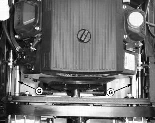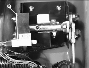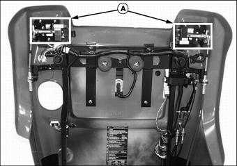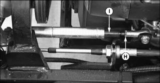 Check Adjustment:1. Park machine on a hard, level surface. 3. Set throttle lever to the 1/2 fast position. · If drive wheels begin to creep, an adjustment is required. Transmission Neutral Adjustment:3. Remove mower deck from the machine. (See Removing Mower Deck in the mower deck operator's manual.) 4. Elevate front of machine with a safe lifting device, wood blocks or jackstands. · Drive wheels must have the ability to rotate freely. · Drive wheels may be removed for better access to the transmission. 5. Move control levers to the swing-out neutral position. 7. Locate both steering control cables (A) under the front mower cowling. 8. Disconnect left and right steering cable rod ends (C). · Loosen and remove locknut (D). · Remove eyebolt (E) from slotted arm plate (F). 9. Have a helper depress bottom of operator seat to activate the seat safety switch. · If drive wheels continue to creep, a transmission drive pump dampener adjustment is required. · If no drive wheel creep is detected, bypass the drive pump dampener adjustment and proceed to the control cable adjustment. Adjust Transmission Drive Pump Dampeners:1. Locate left and right drive pump dampener assemblies (G). 3. Rotate each dampener cylinder (I) until creep is gone. 5. Check adjustment. Continue to adjust dampeners until creep is gone. Adjust Control Cables:1. Loosen steering cable jam nuts (G). NOTE: Eyebolts should be installed to the bottom of each slotted control arm plate. 2. Adjust cable rod ends (C) up or down until eyebolts (E) can be inserted absolutely perpendicular inside the slotted arm plates (F). 3. Install and tighten lock nuts (D). 5. Check adjustment. If further adjustment is required, repeat steps 1-4. Adjusting Control Lever Neutral Start SwitchesBoth control lever neutral safety switch positions (A) are adjustable if necessary. Test Neutral Start Switches1. Park front mower on a hard, level surface. 5. Slowly move both control levers to a centered neutral position. · If properly adjusted, the engine should stop. · If the engine continues to run, a neutral start switch adjustment will be needed. Adjust Neutral Start Switch Position |