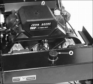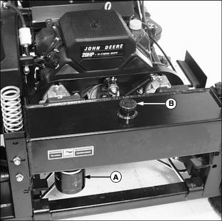 NOTE: Check oil level in reservoir tank when oil is cold. 1. Park machine safely. (See Parking Safely in the Safety section.) 3. Clean area around reservoir dipstick cap (A). 4. Turn and remove dipstick cap from the oil reservoir tank. 6. Install dipstick cap but do not turn it. 8. Check oil level on dipstick. 9. Oil should be to the top of the "FULL COLD" mark (B). Change Hydraulic Oil and Filter1. Park machine safely. (See Parking Safely in the Safety section.) 3. Allow engine and hydraulic oil reservoir to cool. 4. Turn hydraulic oil filter (A) counterclockwise to remove. Allow hydraulic oil to drain into a drain pan with at least a 5.7 L (1.5 gal) capacity. 5. Apply a film of clean oil on gasket of new filter. 6. Install filter. Turn filter clockwise until gasket makes contact with the mounting surface. Tighten 1/2 to 3/4 turn after gasket contact. 7. Clean area around reservoir dipstick cap. 8. Turn and remove dipstick cap (B) from the oil reservoir tank. 9. Fill oil reservoir with approximately 5.7 L (1.5 gal) of oil. 11. Move throttle lever to the fast position.