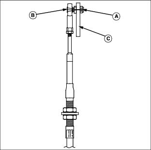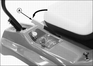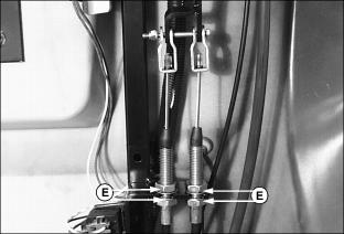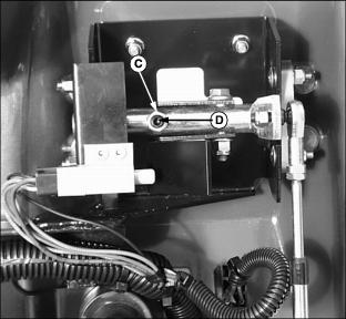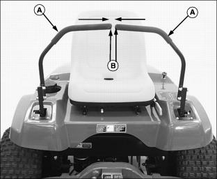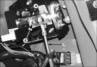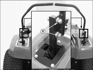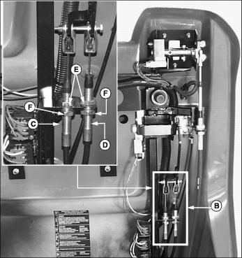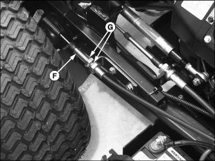 · To decrease brake tension, turn bottom jam nut counterclockwise. · To increase brake tension, turn bottom jam nut clockwise. 12. Move throttle lever to the fast position. 13. Move both control levers to the centered neutral position. Push both control levers forward. · Drive wheels should start to turn freely and front mower should begin to travel forward. · Brakes are adjusted too tight if an audible hydrostatic whine is detected and the front mower does not move. 14. Test and adjust brakes as necessary. Adjust Park Brake-Secondary AdjustmentNOTE: Make park brake secondary adjustment only when the primary adjustment has been completely used up. 2. Loosen upper and lower jam nuts (E). 3. Turn both bottom jam nuts fully to the bottom of the primary adjustment assembly. 4. Locate park brake secondary adjustment (F) on each side of the front mower. 5. Loosen secondary adjustment jam nuts (G). 6. Turn jam nuts 6mm (1/4 in.) forward on each adjustment cable. 8. Make a park brake primary adjustment and tighten jam nuts (E). 9. Test and adjust brakes as necessary. Adjust TrackingA proper tracking adjustment will allow the front mower to maintain a straight line direction of travel. Right and left transmission speeds will vary with travel speed and RPM variations. NOTE: To improve straight line tracking, drive wheel tire pressures must be equal. Check Tracking3. Move both control levers to the centered neutral position. 4. While holding both control levers together, push both control levers forward to a desired mowing speed. · If the front mower travels to the right or left, an adjustment is required. Adjust Tracking1. Park machine safely. (See Parking Safely in the Safety section.) 2. Move both control levers to the centered neutral position. 4. Loosen locknut (A) fastening steering cable eyebolt (B) to slotted control arm plate (C). · If the front mower moves to the left, adjust right control lever. · If the front mower moves to the right, adjust left control lever. 5. Slide cable rod end (D) inside control arm plate adjustment slot (E). · Cable rod end should be slid up (toward seat) in the adjustment slot to slow down the faster transmission pump. · Adjustments should be done in 6mm (1/4 in.) or less increments. 8. Check tracking adjustment. Continue the adjustment process until the front mower travels in a desirable straight line direction. |