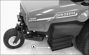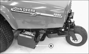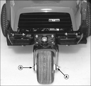 Service Steering & BrakesRemove and Install Front WheelsRemoving:1. Park machine safely. (See Parking Safely in the Safety section.) 2. Slightly loosen five wheel bolts (A). · For right side, locate the jack centered under portion of engine base supporting the fuel tank (A). · For the left side, locate the jack centered under portion of engine base supporting the battery (B). Installing:3. Tighten wheel bolts in numbered sequence shown for safe wheel installation. Tighten bolts alternately until bolts are tightened to 100 N·m (75 lb-ft). Remove and Install Rear Wheel(s)Removing1. Park machine safely. (See Parking Safely in the Safety section.) 2. Align rear wheel(s) so they are pointing straight ahead. 3. Lift rear of front mower with a safe lifting device. Picture Note: Photo shows front mower equipped with the single rear wheel option. 4. Remove hex nut (A), wheel bolt (B). 5. Remove wheel from assembly yoke. 6. Remove steel spacer from wheel hub. Installing1. Install steel spacer into replacement wheel hub. 2. Install wheel bolt and hex nut. Checking and Aligning Control LeversCheck Alignment:1. Park machine safely. (See Parking Safely in the Safety section.) 2. Move both control levers (A) inward to the centered neutral position. 3. Check control levers for equal height and forward and rearward alignment. The gap (B) between the levers should be approximately 6 mm (1/4 in.). · If positions of the control levers are unequal, an adjustment is necessary. Height Gap Adjustment· To increase gap, turn set screw (D) clockwise. · To decrease gap, turn set screw (D) counterclockwise. Forward and Rearward Adjustment3. Adjust control levers forward or rearward until both control levers are aligned. 4. Check adjustment. Repeat adjustment if necessary. Adjusting Park BrakeAdjust Park Brake-Primary Adjustment1. Park front mower on a hard, level surface. NOTE: Park brake lever must be unlocked and in thposition prior to performing a park brake adjustment. 5. Locate primary park brake adjustment assembly (B) under left side of cowling.