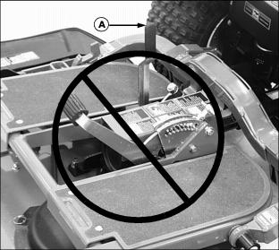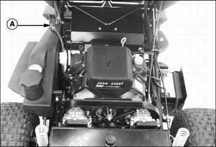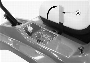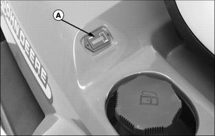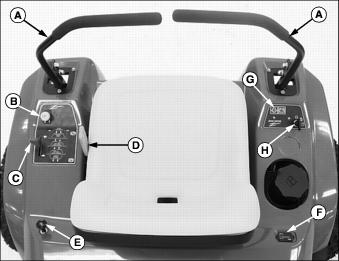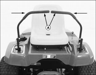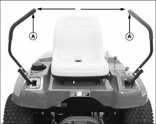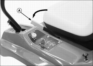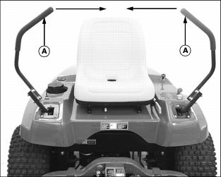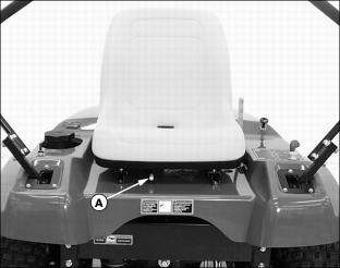 OperatingDaily Operating Checklisto Remove grass and debris from machine. o Clean engine oil cooling fins. o Check area below machine for leaks. Avoid Damage to Plastic and Painted Surfaces· Do not wipe plastic parts unless rinsed first. · Insect repellent spray may damage plastic and painted surfaces. Do not spray insect repellent near machine. · Be careful not to spill fuel on machine. Fuel may damage surface. Wipe up spilled fuel immediately. Operator Station ControlsMiscellaneous ControlsAdjusting Seat1. Sit on the operator's seat. 2. Push and hold lever (A) to the left. 3. Slide seat forward or backward to desired position. Testing the Safety Interlock SystemNOTE: This unit is equipped with a electronic safety interlock. Engine will not start unless the PTO switch is in the disengaged position, the control levers are in the swing-out neutral position and the park brake lever is in thposition. Use the following checkout procedure to check for normal operation of machine. If there is a malfunction during one of these procedures, Do not operate machine. See your John Deere dealer for service. Perform these tests in a clear open area. Keep bystanders away. Testing PTO Safety Switch1. Sit on the operator's seat with the control levers in the swing-out neutral position. 3. Pull PTO switch up to the engaged position. 4. Turn key switch to the start position (A). Testing Seat Safety Switch3. Pull PTO switch up to engaged position. 4. Raise slightly off the seat. Testing Neutral Safety Switch1. Move both control levers inward to the centered neutral position. 3. Push PTO switch down to disengaged position. 4. Turn key switch to the start position (A). Testing Park Brake Safety Switch1. Sit on the operator's seat with the control levers in the swing-out neutral position. 2. Push PTO switch down to disengaged position. 4. Turn key switch to the start position (A). Testing Park Brake1. Stop front mower on a maximum 17° slope. Stop the engine and lock the park brake.