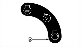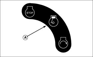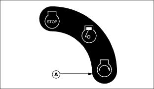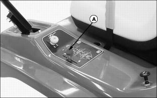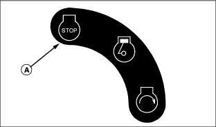 Starting the Engine2. Open the fuel shut-off valve. 4. Move both control levers to the swing-out neutral position. 5. Sit on the operator's seat. NOTE: Check position of machine PTO switch. Switch knob must be pushed down to the off position to start engine. 7. Move throttle lever to set engine speed: · Cold engine: Pull knob up to the choke position. · Warm/Hot engine: If necessary, pull up knob to choke position. 9. Turn key switch to the run position (A). NOTE: The battery indicator light (B) may illuminate if battery voltage is low. 10. Check that the engine oil pressure indicator light (C) illuminates. 11. Turn key switch to the start position (D). Release key when the engine starts. · Push choke knob to the off position. · Move throttle lever to the desired engine speed. Stopping the Engine1. Move control levers to the swing-out neutral position. 2. Move throttle lever to a 1/2 - fast position. 3. Turn key switch to STOP position (A). Using the Throttle LeverPush lever (A) all the way forward to fast position. Use this position when you mow. Pull lever (A) to rear to slow position. Do not run engine at slow idle any longer than necessary. Move lever (A) to the 1/2 to full fast position when stopping the engine. Using the Hour MeterNOTE: The machine is equipped with an electric start. The hour meter digital display will not illuminate or operate with the key switch in the STOP position. The hour meter digital display will illuminate and continue to operate when the key switch is left in the run position. The hour meter (A) shows number of hours the machine has run. The service interval chart gives necessary service intervals. Use the hour meter and service interval chart to determine when machine will need service. Using the PTO Switch KnobEngage PTO:1. Move throttle lever (A) to the 1/2 to 3/4 fast position. 3. Move throttle lever (A) forward to the fast position for mowing. Disengage PTO:Check Indicator LightsOil Pressure Indicator
