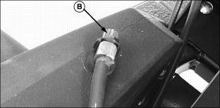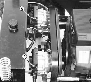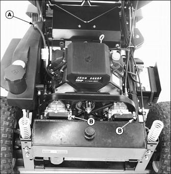 When the machine needs to be moved without starting the engine, use the free-wheeling levers. 1. Park machine safely. (See Parking Safely in the Safety section.) 3. Turn both free-wheeling levers (A) counterclockwise approximately two revolutions. 6. Push machine to desired location. Due to transmission gear reduction, machine will move slowly. Using Fuel Shut-Off Valve2. Open the fuel shut-off valve: · Arrow on knob should face upward as shown in position (B) for fuel flow to be open. 3. Close the fuel shut-off valve: · Arrow on knob should be turned downward as shown in position (C) for fuel flow to be closed. Using the Control LeversThe functions of the control levers are: · Operates as a dual function neutral position. · Controls forward speed and reverse motion. Swing-Out Neutral PositionPicture Note: Control levers shown in the swing-out neutral position. · Control levers (A) must be in the swing-out neutral position and the park brake locked to start the engine. · Forward and reverse movement of the control levers is prevented when control levers are in a swing-out neutral position. · Operator can exit front mower with the engine running when the control levers are in the swing-out neutral position and the park brake is locked. · Control levers must be in the swing-out neutral position to safely enter and exit the operator seat. Centered Neutral PositionPicture Note: Control levers shown in the centered neutral position. · Front mower speed, motion, and direction can be controlled when the engine is running, control levers (A) are in the centered neutral position, and the park brake is unlocked. Forward and Reverse Motion:1. Move throttle lever to the fast position. 3. Move both control levers (A) from swing-out neutral inward. 4. Push the control levers forward to move the front mower forward. Pull the control levers past center rearward at the same time to move the front mower in reverse. · The further forward the control levers are moved, the faster the front mower will travel. Speed Range· Forward: 0-13.2 km/h (0-8.2 mph). · Reverse: 0-6.5 km/h (0-4 mph). To stop forward or reverse motion, pull or push both control levers back until machine comes to a complete stop. Forward Travel:· Push both control levers forward at the same time. Reverse Travel:· Pull both control levers past center rearward at the same time. Gentle Left Turn:· Push right control lever further forward than the left control lever. Gentle Right Turn:· Push left control lever further forward than the right control lever. Sharp Left Turn· Push right control lever forward and pull left control lever rearward at the same time. Sharp Right Turn· Push left control lever forward and pull right control lever rearward at the same time. Transporting Machine1. Use a heavy-duty trailer to transport your machine. 2. Back front mower with attachment onto a trailer. 3. Stop engine and lock park brake. 4. Turn the fuel shut-off valve to the off position. 5. Fasten machine to trailer with heavy-duty straps, chains, or cables. Both front and rear straps must be directed down and outward from machine. |