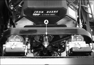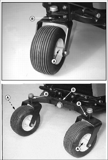 Service LubricationGreaseUse grease based on the expected air temperature range during the service interval. The following greases are preferred: · John Deere Multi-Purpose SD Polyurea Grease. · Meets NLGI Grade #2 Standard JDM J13E4 · John Deere Multi-Purpose HD Lithium Complex Grease. Other greases may be used are: · SAE Multipurpose EP Grease with 3 to 5 percent molybdenum disulfide. Lubricating Rear Wheel Bearing and Spindle1. Park machine safely. (See Parking Safely in the Safety section.) Picture Note: Top photo shows front mower equipped with a single rear wheel option. Bottom photo shows front mower equipped with a wide stance dual wheel option. 2. Lubricate rear wheel bearing(s) (A) and spindle(s) (B). Lubricate Pump Drive Belt Tensioner1. Park machine safely. (See Parking Safely in the Safety section.) |