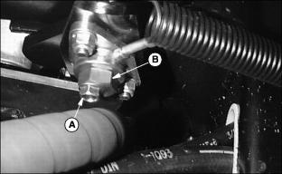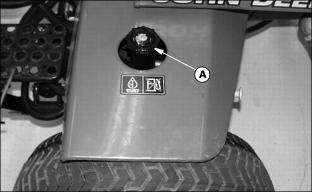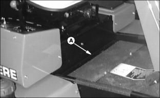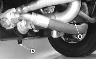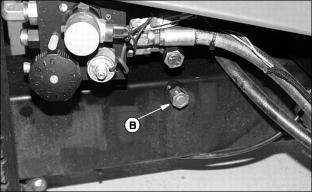 3. Install dipstick and tighten. Remove dipstick and check fluid level. 4. If fluid level is low, add to bring to the TOP of the cross hatch marks on the dipstick. 5. To aid in filling to correct level, remove plug (B) and fill until hydraulic fluid just begins to come out of hole. Replace plug. If overfilled accidently, remove plug and drain sufficient fluid. Changing Transmission Oil And FilterNOTE: Use ONLY John Deere HY-GARD (J20C) Transmission/Hydraulic Oil. 1. Park Mower on a level surface. 2. Run engine to warm oil. STOP engine. 4. Remove filter (B) while oil is draining. 5. Fill new filter half full of clean transmission/hydraulic oil. 6. Install filter quickly to avoid dripping oil. Turn it until seal contacts base, then turn it by hand1/2 turn more. ˇ Capacity is approximately 45.4 L (12 gal.). 9. Start engine. Check for leaks around drain plug and filter. 10. Move lift lever back and forth several times. 11. Stop engine. Check oil level and top off as necessary. Adjusting Transmission Neutral (3215B/3225B)NOTE: The eccentric mechanism is located under the operator's seat and is accessible from the right side of the hydrostatic transmission. 1. Perform a thorough visual inspection of linkages and return springs for damage, before making any adjustment. Repair as necessary. 2. Stop engine and lower cutting units to floor. 3. Shut off 4WD if installed on machine. 4. Raise either side of machine until front wheel is off the ground. Support wheel with a jackstand. Picture Note: Photo taken from underside of 3215B/3225B. 6. Place a 9 kg (20 lb) weight on the seat to activate the seat safety switch. 7. Start engine and run at low idle. 8. Turn eccentric nut (B) forward and backward until drive wheels stop turning. 9. Hold adjustment and tighten shoulder bolt (A). Make sure adjustment did not change. 10. Put pedals in neutral. Depress both forward and reverse speed pedals, then release. 11. Check neutral adjustment. Repeat adjustment until drive wheels stop turning. 12. Lower machine to the ground and test drive the machine to make sure the machine is not moving while in neutral. Adjusting Transmission Neutral (3235B)1. Before making any adjustment, perform a thorough visual inspection of linkages and return springs for damage. Repair as necessary. 2. Stop engine and lower cutting units to floor. 3. Shut off 4WD if installed on machine.