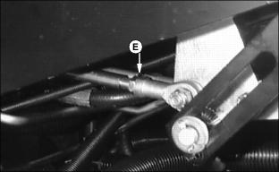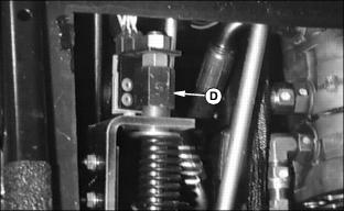 4. Raise left side of machine until left front tire is off the ground. Support tire with a jackstand 5. Remove access panel (A) on floorboard. 6. Loosen nut (B) to allow 4WD switch (C) to hang freely, if machine is equipped with 4WD option. 7. For all 3235B models, loosen nut (E) on ball joint located under front right side of floor board. 8. Place a 9 kg (20 lb) weight on the seat to activate the seat safety switch. 9. Start engine and run at low idle. 10. Turn large adjusting nut (D) forward and backward until drive wheels stop turning. 11. Put pedals in neutral. Depress both forward and reverse speed pedals, then release. 12. Check neutral adjustment. Repeat adjustment until drive wheels stop turning. 13. Tighten nut at ball joint end of rod assembly. 14. For 4WD units, tighten nut to hold 4WD switch in the original position. 15. Install access panel. Lower machine to the ground and test drive the machine to make sure the machine is not moving while in neutral. |