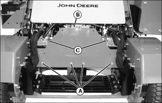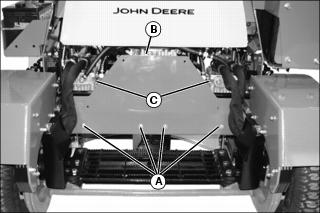3. Remove rear shield (B) to access hydraulic pumps (C).