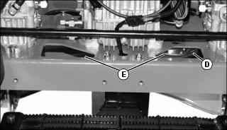 4. Inspect belt (D) through frame openings (E) for excessive wear, damage or stretching.