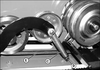 3. Disconnect drive belt tension spring (C) from anchor bolt (D).