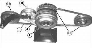 1. Install traction drive belt (F) on drive sheaves (G) and idler pulley (H) as shown. Ensure that traction drive belt is positioned in front of anchor capscrew (I).