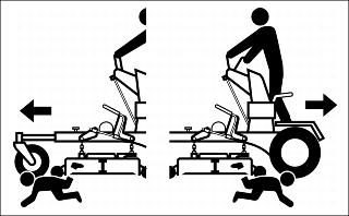 To avoid injury to children, stop mower when children are near. Do not mow in reverse. Look behind when backing. Never carry riders, especially children.