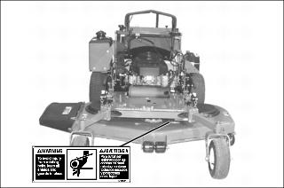 To avoid injury from rotating blades and thrown objects, stay clear of deck edge and keep others away. Do not mow without discharge chute or entire grass catcher in place.
