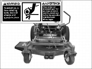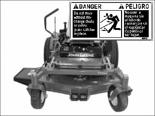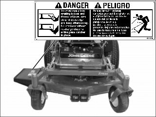 To avoid injury from rotating blades and thrown objects, stay clear of deck edge and keep others away. Do not mow without discharge chute or entire grass catcher in place.