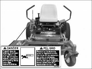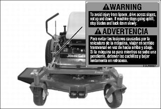 To avoid injury from tipover, drive across slopes, not up and down. If machine stops going uphill, stop blades and back down slowly.