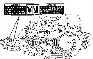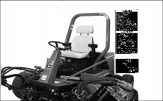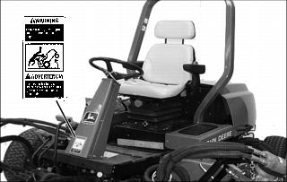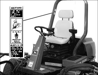 SafetyUnderstanding The Machine Safety LabelsThe machine safety labels shown in this section are placed in important areas on your machine to draw attention to potential safety hazards. On your machine safety labels, the words DANGER, WARNING, and CAUTION are used with this safety-alert symbol. DANGER identifies the most serious hazards. The operator's manual also explains any potential safety hazards whenever necessary in special safety messages that are identified with the word, CAUTION, and the safety-alert symbol. CAUTIONˇ Maintain all safety devices. ˇ Keep people a safe distance away. ˇ Stay clear of power driven parts. ˇ Do Not operate where machine could tip. ˇ Roll-Over Protection Structure (ROPS) should be installed unless prohibited by low clearance operation. ˇ Use seat belts unless machine is operated without ROPS. WARNINGTo avoid injury, avoid quick stops and reduce speed on slopes. WARNINGPicture Note: Two warning labels are on each cutting unit. To avoid injury from rotating blades, stay clear of reel. Shut off engine before servicing lubrication or removing cutting unit. WARNINGTo avoid injury from crushing, always wear seat belt. Do not jump from machine. DANGEREXPLOSIVE GASESCigarettes, flames or sparks could cause the battery to explode. Always shield eyes and face from battery. Do not charge or use cables or adjust poor connections without proper instructions and training. Keep vent caps tight and level POISON CAUSES SEVERE BURNSContains sulfuric acid. Avoid contact with skin, eyes or clothing. In event of an accident, flush with water and call a physician immediately. Keep out of reach of children. Emissions Control System Certification LabelThe emissions warranty described in the warranty section applies only to those engines marketed by John Deere that have been certified by the United States Environmental Protection Agency (EPA) and/or California Air Resources Board (CARB); and used in the United States in non-road mobile (self-propelled or portable/transportable1) equipment. The presence of an emissions label like the one shown signifies that the engine has been certified with the EPA and/or CARB. The EPA and CARB warranties only apply to new engines having the certification label affixed to the engine and sold as stated above in the geographic areas governed by the regulating agencies. NOTE: The hp/kW rating on the engine emissions certification label specifies the gross engine hp/kW, which is flywheel power without fan. In most applications this will not be the same rating as the advertised vehicle hp/kW rating. Operator Training Requiredˇ The owner of the machine is responsible for training the users and mechanics of the machine. ˇ The owner/user can prevent and is responsible for accidents or injuries occurring to themselves, other people, or property. ˇ Do not allow operation or service of the machine by children or untrained adults. ˇ Read the operator's manual and study the safety and operation sections before operating the machine. ˇ If the operator of the machine cannot read or understand this manual, it is the machine's owner responsibility to explain this material to the operator. This publication is available in other languages. ˇ Operate the machine in an open, unobstructed area under the direction of an experienced operator. ˇ Learn the use of all controls. ˇ Operator experience is required to learn the moving, stopping, turning and other operating characteristics of the machine. Avoid Injury From Contacting BladesProtect Others:ˇ Do not let untrained person operate the machine. ˇ Be alert at all times, drive forward carefully. People can move quickly into the mowing area before you know it. ˇ Turn machine off if another person enters the mowing area. ˇ Shut off cutting units when you are not mowing. ˇ Use extra care when you come to blind corners, shrubs, trees, or other objects that may block your vision. ˇ Do not carry or let others ride on machine. ˇ Back carefully. Shut off cutting units and look behind the machine carefully before you back up. Blocked Or Stalled Cutting Units:ˇ Keep all parts of the body away from the cutting edges. Residual hydraulic pressure in the system can cause cutting cylinder rotation when the blockage is released. ˇ Do not reverse reels to unplug cutting units. Wear gloves and use tool or wood to rotate reel. Before You Dismount To Unplug Or Adjust Cutting Units:ˇ Stop engine and wait for reels to stop turning before making any adjustments to the cutting units. ˇ Disengage reel drive by moving MOW/TRANSPORT lever to transport position. Keep hands, feet, and clothing away from cutting units when engine is running. Before Operating MowerRemove foreign objects from machine. Make sure all hardware is tightened. Area to be mowed must be free from wire, stones, glass, cans, or other debris to prevent these objects from being thrown. All guards and shields must be in place and fastened. Brakes, steering, tires, and lights must operate correctly. Check for hydraulic oil leaks. Hydraulic hoses and fittings must be tight. Worn or damaged hoses may burst endangering the operator or cause turf damage. Check Ground Conditionsˇ Clear mowing area of objects that might be thrown. Keep people and pets out of mowing area. ˇ Study mowing area. Set up safe mowing pattern. Do not mow under conditions where traction or stability is doubtful. ˇ First, test drive area with cutting units off but lowered. Slow down when you travel over rough ground. Mount and Dismount SafelyDo not step on pedals when mounting or dismounting. Do not use control levers as hand holds. Do not use cutting unit lift arm, fender or valve as a step. Lower cutting units, lock parking brake, stop engine, and remove key before dismounting. Start Engine SafelySit on seat.ˇ Put all operating controls in neutral. ˇ Move Mow/Transport lever to transport position. Operate Safelyˇ Do not operate machine if you are under the influence of drugs or