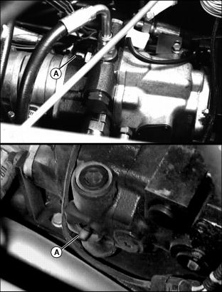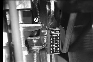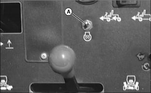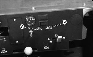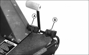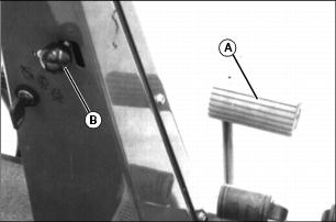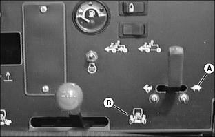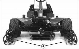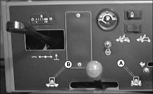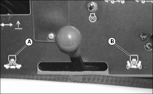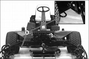 Using Mow/Transport Lever1. Move lever forward to mow position (A) to allow cutting units to be engaged when Lift/Lower lever is pushed forward. 2. Move lever rearward to transport position (B) to disengage reel drive for cutting units. Using Lift/Lower LeverNOTE: Rear cutting units are time-delayed to lower to ground and raise after front cutting units. With Mow/Transport lever forward in mow position:ˇ Move lever forward (A) to lower cutting units to begin mowing operation. ˇ Move lever rearward (B) to lift cutting units while turning during cutting operation. With Mow/Transport lever in transport position:ˇ Move Lift/Lower lever rearward (B) to raise cutting units for transport. Using Engine Cold Start SwitchNOTE: If air temperature is 4°C (40°F) or colder, it may be necessary to warm engine intake air to assist in engine starting. 1. Activate air heater by holding cold start switch (A) down for 20 to 30 seconds. Using Four Wheel Drive Traction Unit (Optional)NOTE: Ground speed will decrease when 4WD is turned on. The four-wheel drive system is automatically turned on with the Mow/Transport lever in mow position. Four-wheel drive is not activated in reverse in either mow or transport position. Moving the lever to the transport position will disengage the 4WD. It can be turned on in transport position using rocker switch. 1. Push rocker switch forward (A) to turn 4WD ON. 2. Push rocker switch rearward (B) to turn 4WD OFF. Using Park BrakeNOTE: The park brake can be used to stop the machine in an emergency. Reels cannot engage with park brake pedal depressed. To lock the park brake:ˇ Move knob (B) to the bottom of the slot. ˇ Push pedal (A) down. Pedal will stay down. To unlock the park brake:ˇ Push and hold pedal (A) down. ˇ Move knob (B) to the top of the slot. Indicator Lightsˇ The "Reel Engaged" indicator (A) will come on when the Mow/Transport lever is moved into the mow position. ˇ "Battery Discharge" indicator (B) will come on when key is first turned on to on and should go out when engine starts. If indicator comes on while operating machine, perform appropriate service. NOTE: C, D, E and F have audible alarm. ˇ "Low Oil Pressure" indicator (C) will come on when key is first turned on to ON and should go out when engine starts.If light remains on or comes on while operating machine, stop engine immediately and perform appropriate service. ˇ "High Engine Temperature" indicator (D), indicates excessive engine heat. Pull over to side of fairway and let engine idle for several minutes to cool down. Perform necessary service to machine before operating. ˇ "High Hydraulic Oil Filter Pressure" indicator (E), indicates above-normal pressure across the hydraulic filter. Replace filter. ˇ "High Hydraulic Oil Temperature" light (F) indicates hydraulic oil is over-heating. Pull over to side of fairway and let engine idle for several minutes to cool down. Perform necessary service to machine before operating. ˇ "Engine Cold Start" indicator (G) will come on when the cold start switch is used in cold weather and will go out when operator releases switch. Safety Interlock SystemFor the starter to engage and the engine to run, the following conditions must be met simultaneously: ˇ Mow/Transport lever must be in the transport position (A). Hydrostatic drive pedals should be in neutral. ˇ Operator should be in seat and/or park brake locked. ˇ If the operator is mowing (Mow/Transport lever forward to mow (B)) and the operator leaves the seat, the engine will stop. ˇ If the operator has stopped mowing, and moves Mow/Transport lever back to transport position and leaves the seat with ground drive in neutral, but without the park brake locked, the engine will stop. ˇ If the operator attempts to drive forward or backward while the park brake is locked, the engine will Stop. ˇ If Mow/Transport is in mow, depressing park brake will shut reels off. Reels will not rotate with the park brake depressed. NOTE: Provision has been made to allow a trained operator to backlap the reels from the ground with the engine running and the cutting units in motion. (See SERVICE-CUTTING UNITS section for procedure.) Starting The Engine2. Put all operating controls in neutral. 3. Move Mow/Transport lever to transport position. 4. Set throttle to 1/4 throttle. ˇ Battery Discharge and Low Oil Pressure indicator lights must light. 6. Hold the cold start switch (B) in position for 20 - 30 seconds, if air temperature is 4°C (40°F) or colder, the air heater should be activated. 7. Turn key to start to start engine. ˇ All indicator lights should light and then go out. 8. Release key to the on position when the engine starts. ˇ All indicator lights should go out. ˇ If any stay on, stop the engine immediately. Diagnose and correct the problem before starting engine. 9. Check that Safety interlock system steps are being followed, if engine does not start. Stopping Engine1. Move throttle lever down to slow idle position (A). Let engine idle momentarily before stopping. 2. Move Mow/Transport lever to transport position (B) and lower cutting units. Using Hydrostatic TransmissionNOTE: Removing foot from FORWARD or REVERSE control pedal will act as a brake for the machine. Top mowing speed for all models and transport speed for the 3235B can be regulated by the Mow Speed Adjustment. 2. Move throttle lever all the way forward to high idle position. 3. To travel forward, slowly push hydrostatic control Forward pedal (A) down. The farther the pedal is pushed down, the faster the mower will travel. ˇ Mowing -- 0-11.2 km/h (0-7 mph) ˇ Transport -- 0-17.7 km/h (0-11 mph) ˇ Mowing -- 0-12 km/h (0-7.5 mph) ˇ Transport -- 0-20 km/h (0-12.5 mph) 4. To travel in reverse, slowly push reverse pedal (B) down. The farther the pedal is pushed down the faster the mower will travel. ˇ Reverse travel speed is 0-8.8 km/h (0-5.5 mph). Transporting Mower On Trailer