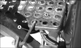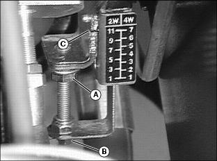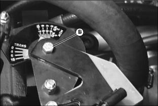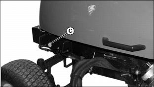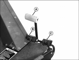 ˇ Loosen two bolts (C) and align bottom arm (A) with corresponding number for desired maximum speed. ˇ Tighten bolts when desired maximum speed is selected. 2. Select maximum transport speed: ˇ Loosen two bolts (C) and align top arm (B) with corresponding number for desired maximum speed. ˇ Tighten bolts when desired maximum speed is selected. Testing Safety SystemsUse the following checkout procedure to check for normal operation of mower. If there is a malfunction during one of these procedures, Do not operate mower. See your John Deere dealer for service. Perform these tests in a clear open area. Keep bystanders away. Testing Mow/Transport Lever Switch2. Depress brake pedal, or lock park brake. 3. Put Mow/Transport lever in mow position. 4. Turn key to start position.