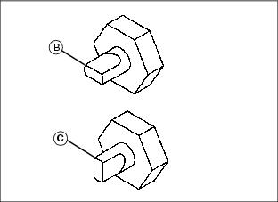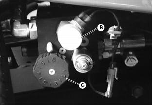 Picture Note: Top photo shows transmission unlock pin (A) on Model 3215B/3225B. Bottom photo shows Model 3235B. To move the mower when engine is not running:1. Raise operator seat to service position. 2. Turn pin to horizontal position (B) to disconnect transmission. 4. Push or pull mower to desired location. 5. Turn pin to vertical position (C) before starting engine. |