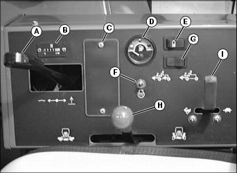 Operating MachineDAILY OPERATING CHECKLISTo Remove grass and debris from machine. o Remove grass and debris from engine compartment and muffler area, before and after operating machine. o Check around hose fittings for leaks. o Check Air Restriction Indicator. o Check reels and bed knives for sharpness and nicks. o Check reel-to-bedknife settings (22 ESP). o Check bedknife-to-reel settings (2500M). o Grease front and rear rollers. o Grease RFS springs (22 ESP). Avoid Damage To Plastic And Painted Surfacesˇ Insect repellent spray may damage plastic and painted surfaces. Do not spray insect repellent near machine. ˇ Be careful not to spill fuel on machine. Fuel may damage surface. Wipe up spilled fuel immediately. Dash ControlsG - Power Assist Switch (Optional) Foot ControlsSteering Column ControlMiscellaneous ControlsPicture Note: Reel knobs are located under the foot platform and under the left fender. Picture Note: Under seat-3215B and 3225B Picture Note: Under seat-3235B A - Mow Speed Adjustment (3215B/3225B)) B - Mow/Transport Speed Adjustment 3235B Indicator LightsA - Engine Oil Pressure Indicator B - Battery Discharge Indicator C - Engine Coolant Temperature Indicator D - Engine Cold Start Indicator F - High Hydraulic Oil Filter Pressure Indicator G - High Hydraulic Oil Temperature Indicator Adjusting Mow Speed (3215B/3225B)1. Loosen nut (A) and turn bolt (B), so that the mark (C) aligns with a corresponding number for desired maximum mow speed. 2. Tighten nut (A) when desired maximum mow speed is selected. Adjusting Mow and Transport Speeds (3235B)