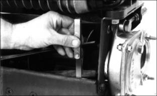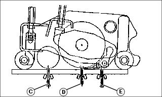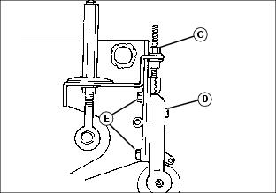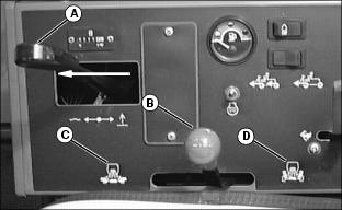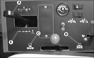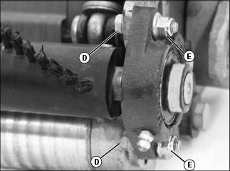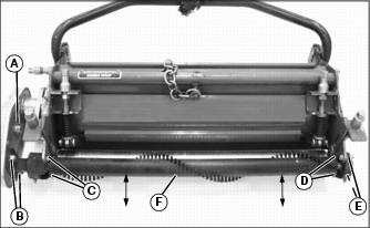 1. Push Lift/Lower lever (A) forward to lower cutting units. 2. Move the Mow/Transport lever (B) forward to mow (C) from transport (D). Shifting to MOW activates a switch so the cutting units automatically engage when lowered. NOTE: In mow position (C), the Lift/Lower lever (A) needs only to be pushed down or pulled back all the way and not held, to lower or raise the cutting units. In the transport position (D), the Lift/Lower lever needs to be held back all the way for the cutting unit to raise all the way to transport height. 3. To begin mowing, pull the Lift/Lower lever (A) back to the lift position. 4. Move the throttle lever forward to the r (fast) position. 5. Slowly begin forward travel. NOTE: The four-wheel drive system (optional) engages when you are in mow (C). If you pull the lever back to transport (D), it changes to two-wheel drive. 6. Push Lift/Lower lever forward (E) to lower cutting units and start reel rotation. ˇ Front cutting units lower to the ground before the rear units. NOTE: While you are in mow position, the two cutting units on the front wings can no longer lift all the way up. They lift just enough to allow for turning. 7. As soon as the first cutting unit reaches the opposite edge of the fairway, pull back the Lift/Lower lever. ˇ The cutting units will raise to mow lift height and automatically turn off. 8. When finished mowing, pull Mow/Transport lever (B) back to transport position. Hold Lift/Lower lever back to raise the cutting units to transport position. 9. Stop machine and let engine run for a short time to cool down engine. Adjusting Bed Knife-to-Reel (2500M)