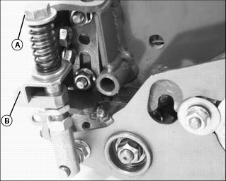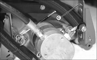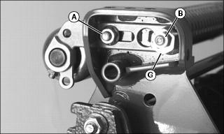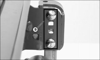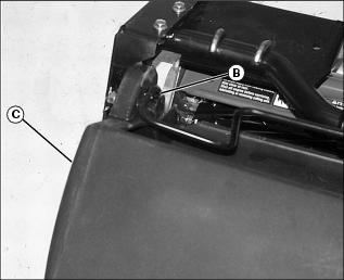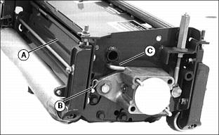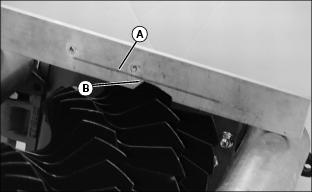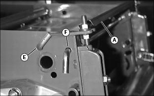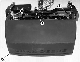 1. Lower cutting units and shut off engine. Lock park brake. 2. Loosen nut (A) on both sides of roller. Move roller adjusters (B) up or down for height selection. Adjusting one roller one notch adjusts the HOC 1.6 mm (1/16 in.). Adjusting front and rear rollers both one notch will change HOC 3.2 mm (1/8 in.). Adjusting Reel-To-Bed Knife Clearance (22 ESP)NOTE: Each flat on the adjustment nut represents 0.025 mm (0.001 in.) movement of the reel. The lower nut (B) will lower the reel when turned counterclockwise and the upper nut (A) will raise the reel when turned clockwise (as viewed from the top of the unit). 1. Adjust the ends of the reel to set clearance with a 0.05 mm (0.002 in.) feeler gauge. 2. Inspect the entire length of the bed knife with a 0.102 mm (0.004 in.) feeler gauge. ˇ It should not go in anywhere. If so, go to Step 4. ˇ If the reel is making contact anywhere, go to Step 3. NOTE: Always rotate the reel in the reverse direction to avoid damaging or dulling the cutting edges of the reel or the bed knife. 3. Slowly rotate the reel backwards watching for contact between the reel and the bed knife at the center of the bed knife. ˇ If contact is made, grind the reel and bed knife to eliminate the "frown" in the bed knife or the out-of-round condition of the reel. 4. Measure the clearance at the center of the bed knife. ˇ If the clearance exceeds 0.102 mm (0.004 in.), grind the reel and bed knife to eliminate the "smile" in the bed knife or the out-of-round condition of the reel. 5. When adjusted and sharpened correctly, each reel blade should cut a single piece of newspaper held at 90° to the top surface of the bed knife along the entire length of the bed knife. Reel should not make contact with bed knife with 0-0.05 mm (0-0.002 in.) maximum clearance. If not, grind reel and bed knife as necessary. Adjusting Grass Deflector (22 ESP)NOTE: Front discharge of grass clippings will minimize grass clumps on fairway. For front discharge:ˇ Position deflector (A) in down position. NOTE: Install rod (C) in hole so bent end is opposite the cutting unit motor. ˇ Place rods (B) and (C) in holes and secure with pull pins. For rear discharge:2. Rotate deflector (A) to up position. 3. Install rod in upper hole (D) and secure with pull pin. For maximum rear discharge opening:ˇ Remove both rods holding deflector and move the deflector (A) to raised position. Place rods through holes (E and F) and secure with pull pins. Emptying The Grasscatchers (22 ESP)1. Stop machine on a level place and lock park brake. 2. Pull Mow/Transport lever back to transport, but leave units raised with the front wing units level. 4. Wait until all moving parts have stopped. 5. For rear cutting units, pull the bent pin (A) just enough to rotate the rear cutting units. 6. Release the catcher hook (B) and remove basket. 7. Place one hand on top of the basket and the other hand in the back (C) of the basket to remove basket. 8. Place the grasscatcher basket back onto the yoke and turn the cutting unit forward to the mowing position. The pin (A) will fall back into place and lock the cutting unit in its forward facing position. 9. Release the catch hook to remove basket for the front three cutting units. Operating/Adjusting Vertical Cutters (22 ESP)NOTE: Installation of optional Oil Cooler and Scalping Motors are recommended for use with the Vertical Cutters.