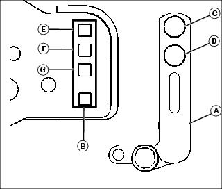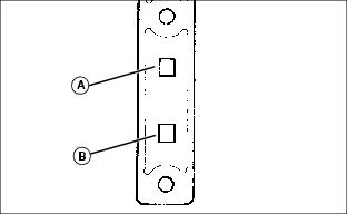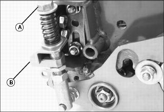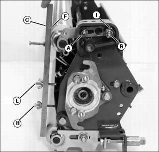 1. Remove cutting reels from machine. 2. Position cutting unit upright on workbench as shown. 3. On both sides of cutting unit, loosen jam nut (A) and turn bed knife tower adjuster (B) counterclockwise until bed knife (C) is tight against cutting reel (D). 4. Slowly tighten tower adjuster (B) clockwise, alternating from side to side until bed knife begins to pull away from the cutting reel. Cutting reel should rotate freely. NOTE: Make sure that the final adjustment to the bed knife is pulling the bed knife away from the cutting reel. 5. With the use of a feeler gauge, alternately turn adjusters (B) no more than one flat at a time until bed knife to reel clearance (E) measures 0.025 mm to 0.050 mm (0.001 in. to 0.002 in.). 6. Tighten jam nuts (A). Check the bed knife-to-reel clearance (E). Adjust again if necessary. Adjusting Height Of Cut Range (2500M)Adjust front roller brackets for the height of cut (HOC) range desired. ˇ Select height-of-cut (HOC) adjustment range by adjusting the position of both front roller brackets. ˇ Alignment of roller bracket (A) and cutting unit frame adjustment holes (B) on each side of the cutting unit will determine the HOC adjustment range. ˇ Refer to chart for desired setting. NOTE: For heights of cuts greater then 19 mm (3/4 in.), replace the rear HOC adjustment bolts with two 19m7385 (M10x70) bolts. Adjusting Front Roller Parallel with Bed Knife (2500M)NOTE: Use of a bench plate or a two or three bolt height of cut gauge bar is recommended when adjusting front roller parallel with the bed knife. Always adjust bed knife-to-reel before adjusting front roller for parallelism. Always make parallelism adjustment after adjusting front roller height of cut range. Parallelism Adjustment with Bench Plate1. Position cutting unit upright on flat surface or workbench. 2. Loosen hex nut (A) and hex nut (B) on the left roller bracket. 3. Set bench plate on a level surface. Set cutting unit on top of bench plate (C). Bed knife (D) must rest firmly against plate stop (E) with cutting reel blade (F) on top of plate stop. 4. Rotate eccentric adjuster (G) until the front roller (H) sits flat and parallel with the bench plate. Gap (I) should not exceed 0.050 mm (0.002 in.) maximum. 5. Tighten left roller bracket hex nut (A). 6. Tighten left roller bracket hex lock nut (B). Parallelism Adjustment with HOC Gauge Bar1. Position cutting unit upright on flat surface or workbench. 2. Loosen hex nut (A) and hex nut (B) on the left roller bracket. NOTE: HOC gauge bar should not contact the bottom of the rear roller.