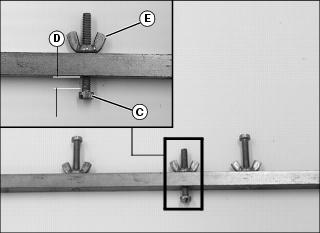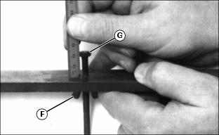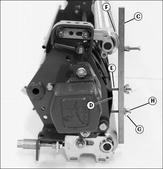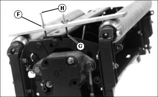 3. Rest HOC gauge bar (C) approximately 51 mm 4. Hook the center gauge screw (E) on the edge of the bed knife. Hold end of gauge bar against the bottom of front roller (F). 5. Loosen wing nut (G). Turn lower gauge screw (H) clockwise until top of screw makes contact with flat edge of bed knife. NOTE: HOC gauge bar should not contact the bottom of the rear roller.