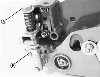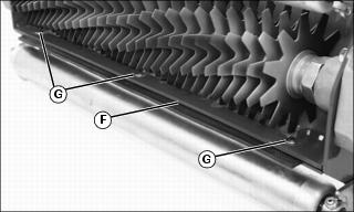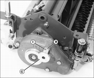 The conditioner process involves shallow vertical cutting. The blades are adjusted to cut runners and lift horizontal leaf material. It is important that frequent and thorough observations be performed or stress to the plants may occur. Make adjustments as necessary. NOTE: It is normal for grass catchers to fill faster when conditioning. 1. Condition fairways the first time with blades set the same as Height of Cut. Closely examine each fairway and note any inconsistencies or appearance of over-aggressiveness. Decrease FTC penetration if necessary. 2. Check each fairway 1-2 hours after cutting. Look for any tendency toward a yellow or brown tint. This indicates over-stress. 3. If visible stress is observed, decrease FTC penetration to 0.39 mm (.016 in.). 4. Continue cutting/conditioning at this setting for three to five days. Check frequently for stress. 5. If no stress is observed, increase FTC penetration by 0.25 mm (0.010 in.). Check for obvious over-aggressiveness. Observe for two to three days, watching for signs of stress. 6. Repeat Step 5, until stress becomes visible. Back off the FTC adjusted penetration by 0.25 mm (0.010 in.). NOTE: Stress is a cumulative result of many factors such as irrigation, temperature, humidity, chemical application, disease, thatch, etc. Conditioning aggressiveness will require adjustment and monitoring as these factors vary. Conditioning frequency may also need to be reduced in some cases. Adjusting (Optional) Fairway Tender ConditionerNOTE: Height Of Cut must be adjusted prior to adjusting the Fairway Tender Conditioner. ˇ Press down on FTC adjuster bolts (A). ˇ Swing adjuster stops (B) around toward the front of the cutting unit. 2. Position cutting unit for making height of cut adjustment. 3. Set FTC adjustment screw (C) on the gauge bar to the desired operating height. ˇ Adjustment screw (D) may need to be loosened so that the gauge bar can rest on both the front and rear rollers. 4. Place preset gauge bar on cutting unit. Hook height of cut screw (E) on bed knife. The ends should rest firmly on the front and rear rollers. 5. Loosen adjuster lock nut (F) on both ends of the cutting unit. 6. Turn adjuster bolt (A) to raise or lower FTC roll. Alternate from end to end until the teeth touch the screw on the gauge bar. Tighten adjuster lock nuts. ˇ Pull knob (G). Turn knob clockwise to the "run" position. Knob must engage detent (H). ˇ Turn knob counterclockwise to the "off" position. Knob must engage detent (I). 10. Disengage FTC adjuster stops. ˇ Press down on FTC adjuster bolts (A). ˇ Swing adjuster stops (B) around toward the rear of the cutting unit. Adjusting (Optional) Rear Roller Powered BrushNOTE: It is not necessary to remove the brush cover to adjust the powered brush. 1. Loosen idler gear pivot lock nut (A). 2. Loosen both pivot bracket lock nuts (B). 3. Loosen two flange head cap screws (C) on left side of cutting unit. 4. Loosen two flange head cap screws (D) and nylock nuts (E) on right side of cutting unit. NOTE: The brush bristles should just barely clear the full length of the roller. The gap between the brush bristle tips and the roller should be approximately 1 mm (1/32 in.). 5. Slide the rear roller powered brush (F) up or down to adjust the roller. 6. Tighten flange head cap screws (C) on left side of cutting unit and flange head cap screws (D) and nylock nuts (E) on right side of cutting unit. 7. Tighten both pivot bracket lock nuts (B) and the idler gear pivot lock nut (A). Operating and Adjusting (Optional) 2500M Vertical CuttersNOTE: Vertical cutting units (A) are intended for thatch removal and should not be set for ground engagement. The cutters should not be set to penetrate the soil. For excess thatch conditions, several trips across the green may be necessary. Do not attempt to remove large amounts of thatch in a single cutting.