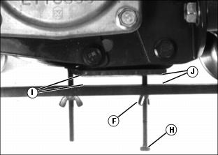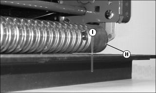 7. Rest HOC gauge bar (C) approximately 51 mm 8. Hook the center gauge screw (E) on the edge of the bed knife. Hold end of gauge bar against the bottom of front roller (F). 9. Adjust position of front roller. ˇ Rotate eccentric adjuster (I) until top of lower gauge screw (H) makes contact with the bed knife. 10. Tighten left roller bracket hex nut (A). 11. Tighten left roller bracket hex lock nut (B). 12. Check adjustment using HOC gauge bar. Adjusting Height of Cut (2500M)1. Position cutting unit upright resting on the rear roller brackets. 2. On both sides of rear roller, loosen lock nut (A) just enough for the height-of-cut (HOC) bracket (B) to slide. NOTE: If machine is equipped with the optional rear roller powered brush, the idler gear pivot lock nut and pivot bracket lock nuts must be loosened. 3. On the height of cut (HOC) gauge bar, set center adjustment bolt head (C) at the desired height of cut (D). Lock wing nut (E). 4. Rest HOC gauge bar against front roller (F) approximately 51 mm (2 in.) from the end of the bed knife. Set the inside of the bolt head (G) against the edge of the bed knife. 5. Turn tower adjuster (H) until the rear roller (I) contacts the HOC gauge bar. Repeat for the other side of the cutting reel. 6. Check HOC adjustment setting from side to side and adjust if necessary. Tighten lock nut (A) on both sides of cutting unit. Adjusting Cutting Unit Shield (2500M)NOTE: Keeping the shield close to the cutting blades improves the performance of the grass catcher in most conditions. 1. Loosen two bolts (A) and lock nuts on each side of cutting unit. 2. Raise or lower shield (B) to desired position. ˇ Maintain an approximate 1.5 mm (0.06 in.) clearance between the bottom of the shield and the top of the cutting blades. Removing and Emptying Grasscatchers (2500M)Picture Note: Top photo shows grasscatcher installed onto the frame assembly. 1. Pull back on the release catch hook (A). 2. Lift and remove basket (C) from catcher bracket support hook (B). 3. Remove basket (C) from catcher bracket support hook (B) and empty. 4. Install grass catcher onto the frame assembly. Adjusting Height-Of-Cut After Servicing (22 ESP)NOTE: The following procedure is to be used for initial setup, HOC fine tuning or after servicing the cutting unit. For quick field adjustments, see Height-of-Cut Field Adjustment in this section. 1. Raise cutting units to RFS position. 2. Shut off engine and lock park brake. 3. Adjust reel-to-bed knife before adjusting HOC. 4. Adjust Height of Cut Range: NOTE: Height of Cut has two general height settings (3/8 in. to 1-5/8 in.) and (1-1/2 in. to 3-1/2 in.). Adjusters must be installed with carriage bolt in top hole (A) (stud end) for HOC lower than 1.5 inches, and the bottom hole (B) for HOC greater than 1.5 inches. ˇ If HOC range needs to be changed, loosen nut (C). Remove nut and washer (D) and two bolts (E) and position the carriage bolt in the correct hole for the cutting height range desired. NOTE: Using a single-bolt adjusting gauge bar will not insure parallelism between rollers and may result in uneven height of cut. If rollers are adjusted to a position so gauge bar cannot be installed, raise either the front or rear roller or both to allow installation of the gauge bar. a. To adjust to less than 1.6 mm (1/16 in.) or check for parallelism, loosen wing nut (F) on gauge bar bolt. Set height of cut by measuring from the top of the gauge to the bottom of the head of the bolt (G). Lock wing nut (F). b. Hook head of bolt (G) over edge of bed knife. (Cutting unit is upside down for photo clarity.) c. Loosen wing nut (F). Turn bolt (H) until gauge is parallel with bed knife. Measure distance between front (I) and rear (J) of the bottom of the bed knife to top of gauge. Distance should be the same at both points. 6. Adjust Rear Roller Assembly: NOTE: Set rear roller first and then adjust front roller. Rear rollers come from factory set and leveled at 3/4 in. cut. To avoid binding mechanisms, make small adjustments on each end of the roller. a. Loosen bolts (L) and adjustment nuts (K) (both sides) on the rear roller and center the bolts in the slots. Tighten bolts and adjustment nuts. b. To adjust roller in 1.6 mm (1/16 in.) increments, loosen nut (M) (both sides) to allow positioning the roller as close to the gauge bar as possible without touching it. Tighten nuts (K). Ensure the same number of rachet teeth are exposed at each end of the roller. c. To adjust height of cut to less than 1.6 mm (1/16 in.), loosen bolts (L) and turn adjustment nuts (K) alternately until roller just touches the gauge bar. This is determined by turning the roller and listening for the scratching sound from roller on gauge bar. Repeat on opposite end. Recheck the adjustment for the opposite side and readjust if necessary. d. Tighten all hardware and recheck with gauge bar to ensure setting did not change. 7. Adjust Front Roller Assembly: NOTE: Set rear roller first and then adjust front roller. To avoid binding mechanisms, make small adjustments on each end of the roller. a. Loosen bolts (L) and adjustment nuts (K) (both sides) on the rear roller and center the bolts in the slots. Tighten bolts and adjustment nuts. b. To adjust roller in 1.6 mm (1/16 in.) increments, loosen nut (M) (both sides) to allow positioning the roller as close to the gauge bar as possible without touching it. Tighten nuts (K). Ensure the same number of rachet teeth are exposed at each end of the roller (should match rear roller setting). c. To adjust height-of-cut to less than 1.6 mm (1/16 in.), loosen bolts (L) and adjustment nuts (K) and turn adjustment nuts (K) alternately until roller just touches the gauge bar. This is determined by turning the roller and listening for the scratching sound from roller on gauge bar. Repeat on opposite end. Recheck the adjustment for the opposite side and readjust if necessary. d. Tighten all hardware and recheck with gauge bar to ensure setting did not change. Hei