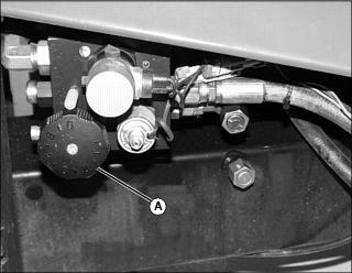 1. Park fairway mower on a hard, level surface. 2. Stop engine and engage park brake. 3. Locate reel speed control knob (A) on the left side of machine. NOTE: Variances in reel speed may occur when knob settings are equal. Use a reel tachometer to verify that the front and rear reels are turning at the same speed for the same knob settings. ˇ Reel speed can be adjusted depending on the type of application for the fairway mower, which type of cutting units are used, and grass height and conditions. ˇ It may be appropriate to reduce reel speed when cutting taller grass to prevent grass from being blown over and not being cut. Faster reel speeds with dry grass may cause grass clippings to be thrown over the grasscatcher. ˇ For mowing fairways, set the speed control knob (A) to the highest setting fully to the left (counterclockwise) for best cutting performance.