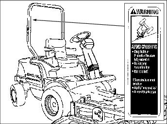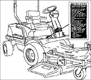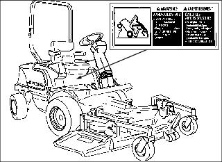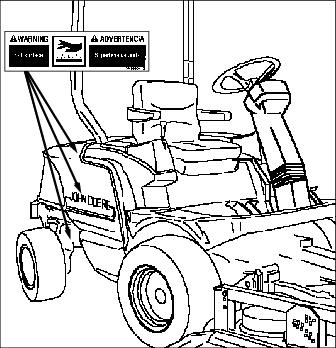 SafetyUnderstanding the Machine Safety LabelsThe machine safety labels shown in this section are placed in important areas on your machine to draw attention to potential safety hazards. On your machine safety labels, the words DANGER, WARNING, and CAUTION are used with this safety-alert symbol. DANGER identifies the most serious hazards. The operator's manual also explains any potential safety hazards whenever necessary in special safety messages that are identified with the word, CAUTION, and the safety-alert symbol. WARNINGCAUTION· Keep children and others away · Stay clear of power driven parts · Do not operate where machine could tip · Roll-over protection structure (ROPS) should be raised unless prohibited by low clearance operation · Use seat belts unless ROPS is in lowered position WARNING· Move very slowly when attachment is removed · Keep attachment low when transporting WARNING· Keep Rollover Protective Structure fully extended CAUTIONTO MAINTAIN STEERING CONTROL AND STABILITY See operator's manual for ballasting recommendations ROLL-OVER PROTECTIVE STRUCTURETo maintain operator protection and ROPS certification: · Replace damaged ROPS, do not repair or revise · Any alteration of ROPS must be approved by manufacturer CERTIFICATIONPerformance certified at date of manufacture to: Two Post ROPS - OSHA: 29 CFR, Part 1928, Subpart C John Deere Mowers, 1400 Series Deere & Company, Moline, Illinois, U.S.A. Emissions Control System Certification Label (NonRoad Diesel)The emissions warranty described in the warranty section applies only to those engines marketed by John Deere that have been certified by the United States Environmental Protection Agency (EPA) and/or California Air Resources Board (CARB); and used in the United States in non-road mobile (self-propelled or portable/transportable1) equipment. The presence of an emissions label like the one shown signifies that the engine has been certified with the EPA and/or CARB. The EPA and CARB warranties only apply to new engines having the certification label affixed to the engine and sold as stated above in the geographic areas governed by the regulating agencies. NOTE: The hp/kW rating on the engine emissions certification label specifies the gross engine hp/kW, which is flywheel power without fan. In most applications this will not be the same rating as the advertised vehicle hp/kW rating. Emission Control System Certification Label (Small Off-Road Gas Engines)NOTE: Tampering with emission controls and components by unauthorized personnel may result in severe fines or penalties. Emission controls and components can only be adjusted by EPA and/or CARB authorized service centers. Contact your John Deere Commercial and Consumer Equipment Retailer concerning emission controls and component questions. The presence of an emissions label signifies that the engine has been certified with the United States Environmental Protection Agency (EPA) and/or California Air Resources Board (CARB). The emissions warranty applies only to those engines marketed by John Deere that have been certified by the EPA and/or CARB; and used in the United States and Canada in off-road mobile equipment. Emission Compliance Period (Small Off-Road Gas Engines)If your engine has the emission compliance category listed on the emission control system certification or air index label, this indicates the number of operating hours for which the engine has been certified to meet EPA and/or CARB emission requirements. The following table provides the engine compliance period in hours associated with the category found on the certification label. CertificationYour product has been tested and evaluated by the manufacturer and conforms with American National Standard B-71.4, "Safety Specifications" for commercial turf care equipment. Operator Training Required· The owner of the machine is responsible for training the users and mechanics of the machine. · The owner/user can prevent and is responsible for accidents or injuries occurring to themselves, other people, or property. · Do not let children operate the machine. Local regulations may restrict the age of the operator. · Read the operator's manual and study the safety and operation sections before operating the machine. · If the operator of the machine cannot read or understand this manual, it is the machine's owner responsibility to explain this material to the operator. This publication is available in other languages. · Operate the machine in an open, unobstructed area under the direction of an experienced operator. · Learn the use of all controls. · Operator experience is required to learn the moving, stopping, turning and other operating characteristics of the machine. Wear Appropriate Clothing· Always wear safety goggles, or safety glasses with side shields, and a hard hat when operating the machine. · Wear close fitting clothing and safety equipment appropriate for the job. · While mowing, always wear substantial footwear and long trousers. Do not operate the equipment when barefoot or wearing open sandals. · Wear a suitable protective device such as earplugs. Loud noise can cause impairment or loss of hearing. Operating Safely· Only allow responsible adults, who are familiar with the instructions to operate the machine. Local restrictions may restrict the age of the operator. · Inspect machine before you operate. Be sure hardware is tight. Repair or replace damaged, badly worn, or missing parts. Replace faulty silencers. Be sure guards and shields are in good condition and fastened in place. Make any necessary adjustments before you operate. · Before using, always visually inspect to see that the blades, blade bolts and the mower assembly are not worn and damaged. Replace worn and damaged blades and bolts in sets to preserve balance. · Be sure all drives are in neutral and parking brake is locked before starting engine. Only start engine from the operator's position. · Do not change the 
