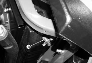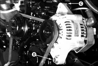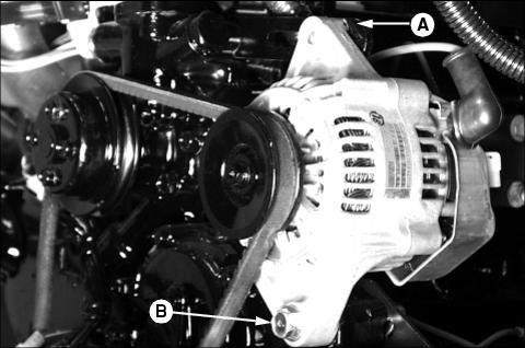 · Apply finger pressure to the belt approximately halfway between the alternator and water pump pulleys at (B). Belt should deflect 10-15 mm (3/8 - 1/2 in.). Adjust if too tight or too loose.