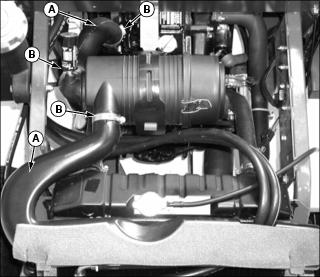 1. Clamp the fuel hose (B) above fuel filter using locking pliers.
