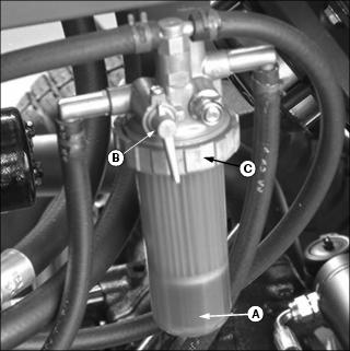 2. Loosen the clamps (C) on fuel hoses above and below fuel filter.