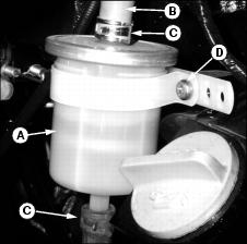 4. Loosen the screw (D) holding the filter mounting strap to the engine block, and remove fuel filter from engine.