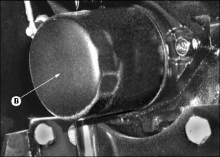 6. Remove oil filter (B) located under the left side of the engine. Turn filter counterclockwise to remove.