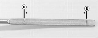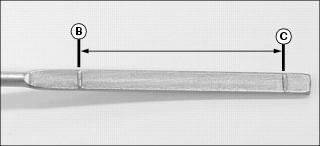 4. Install dipstick, then remove again. Check oil level. Oil should be between levels (B) and (C) on the dipstick.