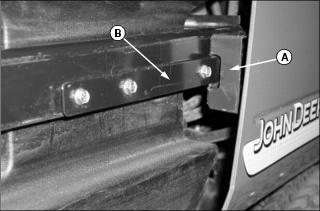 1. Line up slides (A) on inside of engine cover with rails (B) on left and right side of machine.
