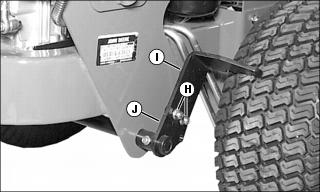 4. Loosen the two nuts (H) retaining slotted right side brake arm (I) to bracket (J), adjust the position of the arm as necessary, and tighten the nuts.