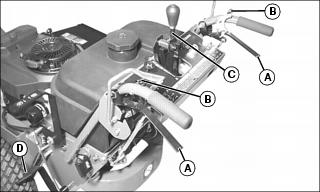 4. Push and pull the machine. The brake arm (D) teeth should firmly grip both tire treads and the rear drive wheels should skid: