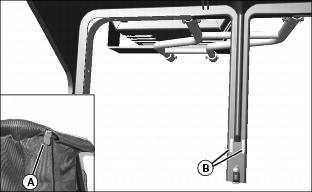 1. Install grass bags to hopper frame by inserting clip (A) into hole (B) in center frame bag support.